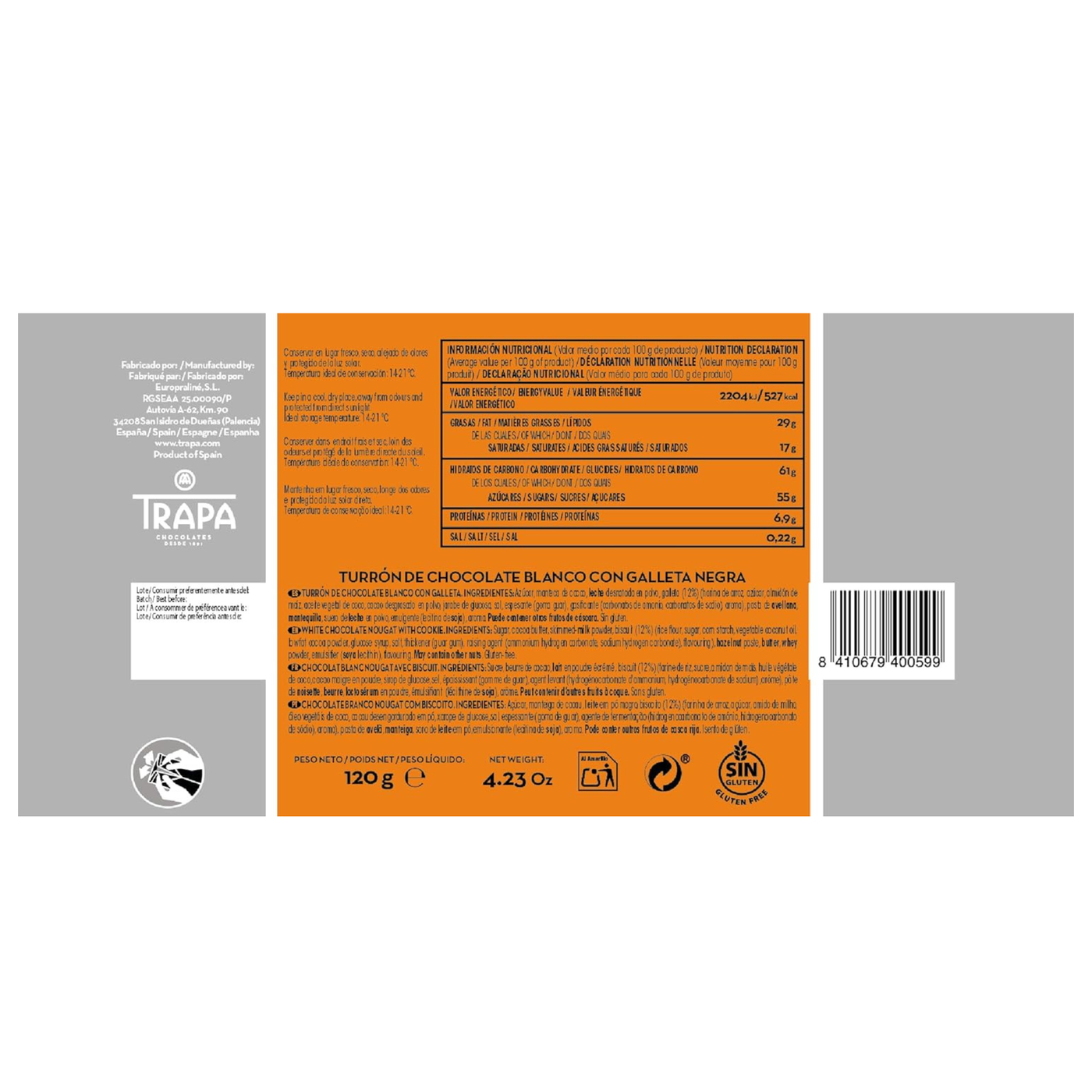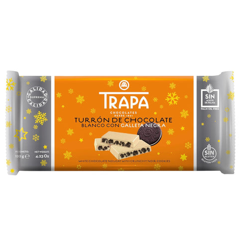 The Trapa Turrón de Chocolate Blanco con Galleta Negra is a delightful blend of creamy white chocolate nougat and crunchy black cookie pieces. Crafted in Spain, this indulgent bar delivers a smooth, sweet white chocolate base perfectly balanced with rich cookie crunch in every bite.