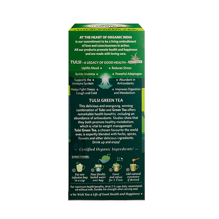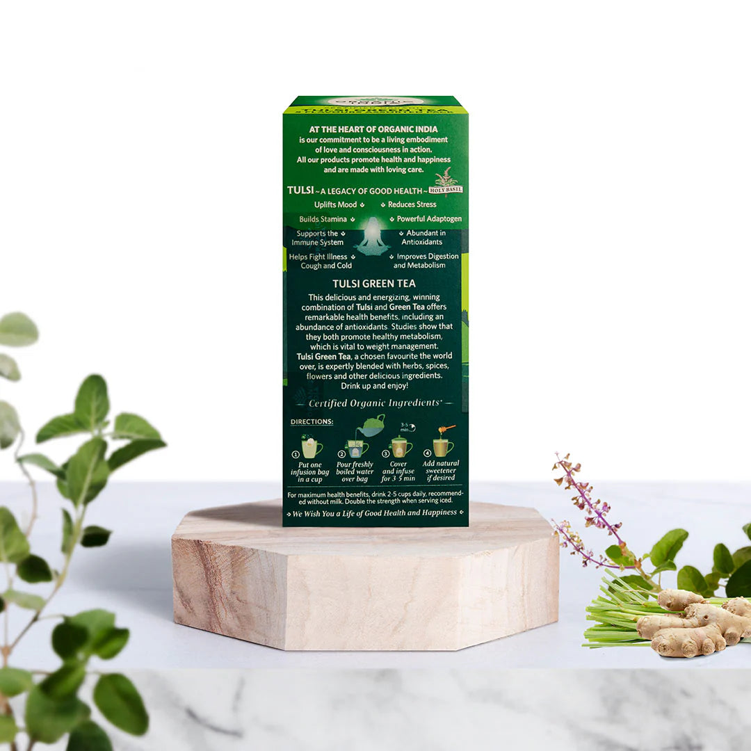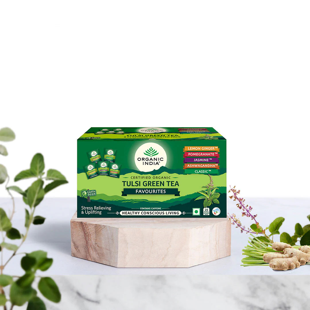 Organic India Tulsi Green Tea Favourites brings together five of the most loved Tulsi Green Tea blends in one convenient box. Every tea bag contains the powerful synergy of Tulsi (Holy Basil) and organic green tea, combined with unique herbs, fruits, and flowers to deliver exceptional taste and health benefits.