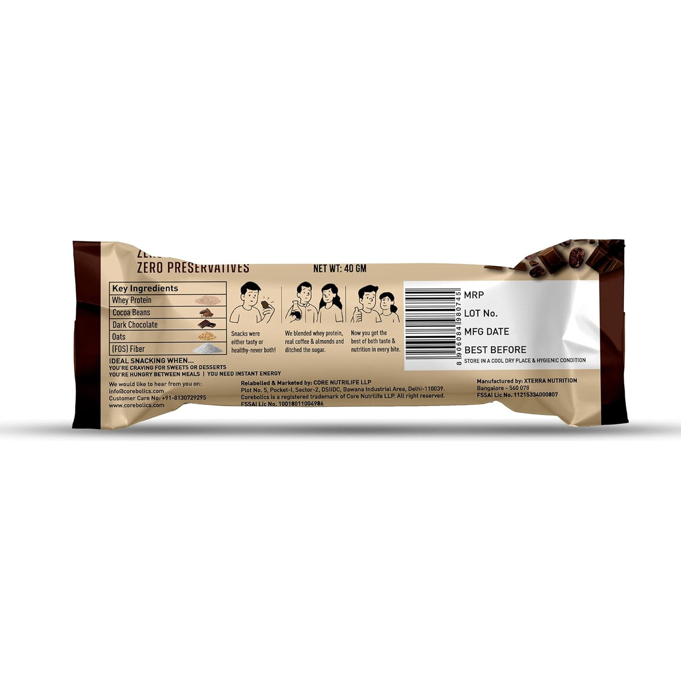 Fuel your day with Corebolics Zero Bar Coffee Chocolate, a delicious high-protein snack that combines bold coffee flavor with premium dark chocolate. Designed for fitness lovers, athletes, and busy professionals, this bar delivers 10 g of protein, zero added sugar, and zero gluten — the perfect guilt-free snack that keeps you energized and satisfied.