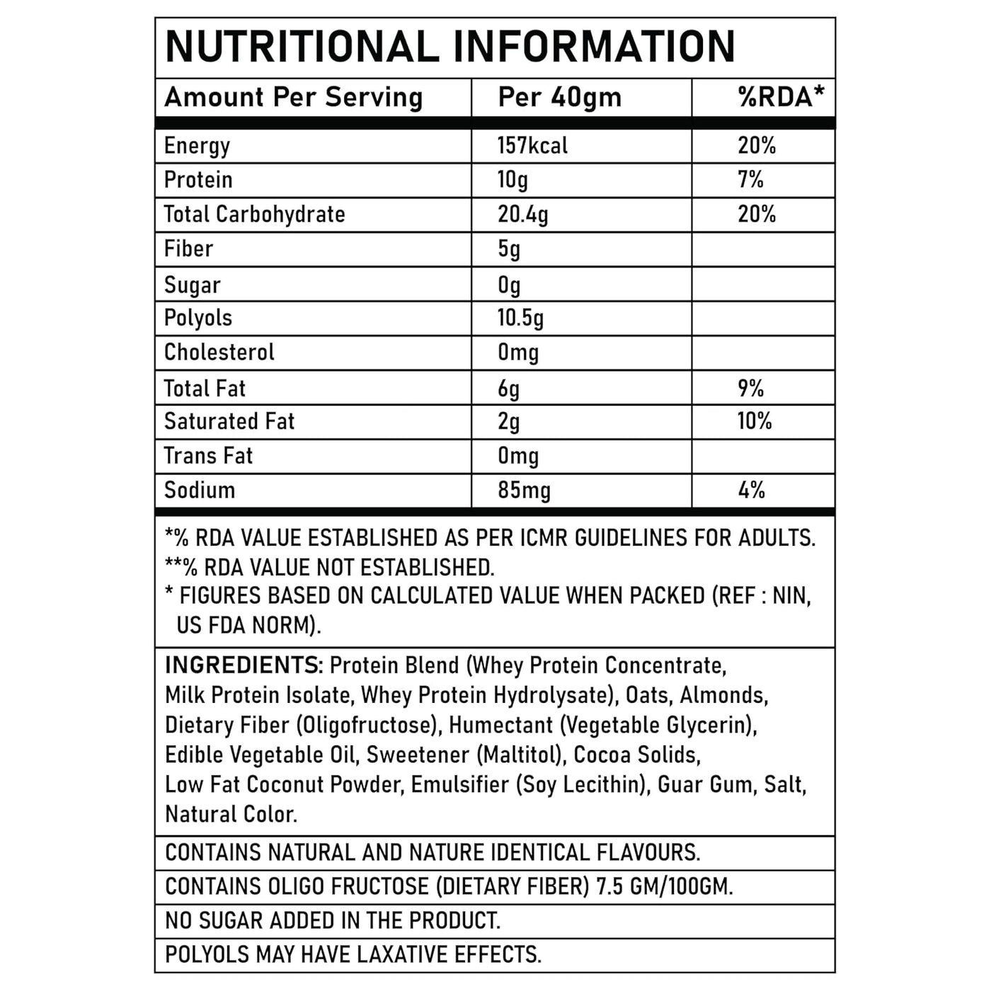 Other Ingredients: Oats, Almonds, Dietary Fiber (Oligofructose), Vegetable Glycerine, Edible Vegetable Oil, Sweetener (Maltitol), Cocoa Solids, Low Fat Coconut Powder, Emulsifier (Soy Lecithin), Guar Gum, Salt, Natural Color.