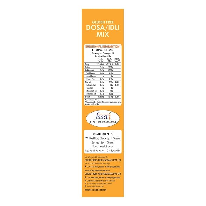 Enjoy the authentic taste of South Indian delicacies with Wheafree Gluten-Free Dosa/Idli Mix — your perfect ready-to-cook blend for soft, fluffy idlis and crisp golden dosas. Made from a wholesome mix of white rice, black split gram, Bengal gram, and fenugreek seeds, this gluten-free flour ensures authentic flavor and nutrition without compromising on health.