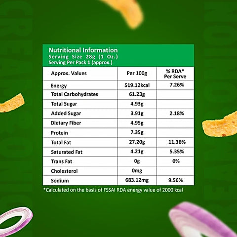 Corn Grits, Edible Vegetable Oil (Corn Oil), Seasoning Mix (Cream & Onion Flavor), Sugar, Salt, Onion Powder, Natural & Nature Identical Flavouring Substances, Spices & Condiments, Anti-Caking Agent (E551), Acidity Regulators (E330, E296).