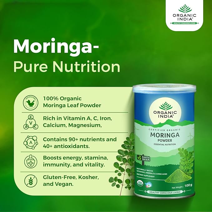 Experience pure vitality with Organic India Moringa Powder, a nutrient-dense superfood made from 100% certified organic moringa leaves. Known as the “Miracle Tree”, Moringa is packed with essential vitamins, minerals, amino acids, and antioxidants that help energize your body, strengthen immunity, and support overall wellness.